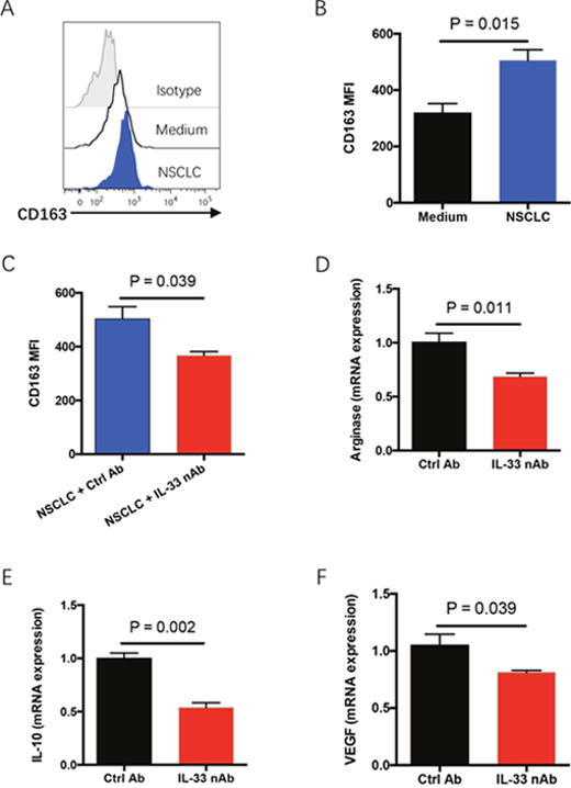 Figure 4: IL-33 blockade abrogates polarization of M2 TAMs in tumor microenvironment. (A, B) Fresh TILs were treated with M-CSF (10 ng/ml) plus IL-10 (10 ng/ml) and co-cultured with or without NSCLC cells for 4 days. CD68-positive macrophages were gated from TILs and analyzed for CD163 expressions. Representative histograms and collective data (mean±SEM) from 6 independent experiments are shown. (C) Fresh TILs were incubated with M-CSF (10 ng/ml), IL-10 (10 ng/ml) and NSCLC cells in the presence or absence of IL-33 neutralizing antibody (10μg/ml) for 4 days. CD163 expression on CD68-positive macrophages was detected by flow cytometry. Shown are mean±SEM from 6 independent experiments. (D-F) Fresh tumor fragments from NSCLC patients were implanted into NSG mice, treated with IL-33 neutralizing antibody for 7 days and detected for expressions of M2 TAM-related genes including arginase 1 (D), IL-10 (E) and VEGF (F). Shown are mean±SEM from 6 independent experiments.