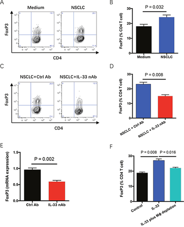 Figure 5: IL-33 blockade reduces Treg accumulation in tumor microenvironment. (A, B) Fresh TILs were stimulated with anti-CD3 antibody (5μg/ml) plus anti-CD28 antibody (5μg/ml) and co-cultured with or without NSCLC cells for 4 days. Frequency of FoxP3-expressing CD4 T cells in TILs was analyzed by flow cytometry. Representatives and data (mean±SEM) from 5 independent experiments are shown. (C, D) Fresh TILs were incubated with anti-CD3 antibody (5μg/ml), anti-CD28 antibody (5μg/ml) plus NSCLC cells in the presence of IL-33 neutralizing antibody (10μg/ml) or the control for 4 days. Representatives and data (mean±SEM) from 5 independent experiments are shown. (E) Fresh tumor fragments from NSCLC patients were implanted into NSG mice, treated with IL-33 neutralizing antibody for 7 days and detected for FoxP3 expressions. Shown are mean±SEM from 6 independent experiments. (F) Fresh TILs with or without depletion of macrophages were stimulated with anti-CD3 plus anti-CD28 antibodies (5μg/ml) in the presence or absence of IL-33 protein (20 ng/ml) for 4 days. Shown are mean±SEM from 5 independent experiments.