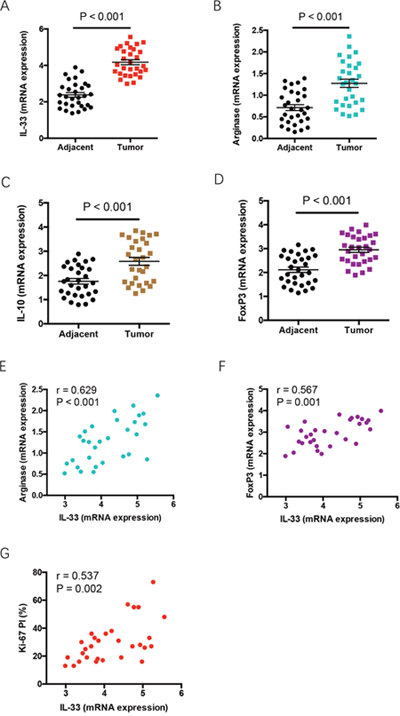 Figure 6: Increased IL-33 expression reflects tumor outgrowth and immune escape features in tumor tissues. (A-D) Expressions of IL-33, arginase 1, IL-10 and FoxP3 were analyzed in tumor tissues and adjacent tissues from NSCLC patients (n=30) by qPCR. Shown are relative expression normalized to the internal control. (E-G) IL-33 expression in tumor tissues was analyzed for correlations with expressions of arginase 1 and FoxP3, and Ki-67 PI in NSCLC patients. Each dot represents the data from an individual patient.