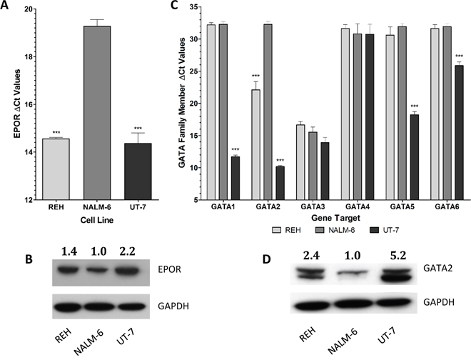 Figure 1: EPOR and GATA family members are differentially expressed between ETV6/RUNX1 positive and ETV6/RUNX1 negative ALL cell lines. (A) The expression of EPOR was analyzed in REH (ETV6/RUNX1 positive), NALM-6 (ETV6/RUNX1 negative) and UT-7 (EPOR positive control) cells in triplicate by Q-PCR. Expression values were corrected to 18S ribosomal RNA levels. Mean corrected Ct values (±SD) are shown and statistical differences to NALM-6 were detected by one-way ANOVA and are indicated by *** (p < 0.001). (B) Western blot analysis of EPOR expression in protein extracted from REH, NALM-6 and UT-7 cells. GAPDH was used as a loading control. EPOR expression levels were calculated relative to NALM-6 by densitometric analysis using GAPDH as a normalization factor. (C) The expression of each GATA family member (GATA1-6) was analyzed in REH, NALM-6 and UT-7 cells in triplicate by Q-PCR. Expression values were corrected to 18S ribosomal RNA levels. Mean corrected Ct values (±SD) are shown and statistical differences to NALM-6 were detected by one-way ANOVA and are indicated by *** (p < 0.001). (D) Western blot analysis of GATA2 expression in protein extracted from REH, NALM-6 and UT-7 cells. GAPDH was used as a loading control. GATA2 expression levels were calculated relative to NALM-6 by densitometric analysis using GAPDH as a normalization factor.