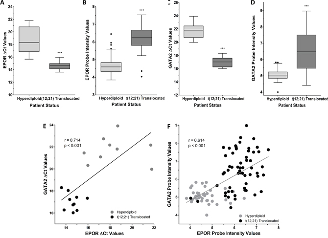 Figure 2: EPOR and GATA2 are differentially expressed between ETV6/RUNX1 positive and ETV6/RUNX1 negative ALL patients. (A) The expression of EPOR was analyzed in hyperdiploid (N=10) and t(12;21) translocated (N=10) ALL patients by Q-PCR. Expression values were corrected to 18S ribosomal RNA levels. (B) EPOR probe intensities (probe ID: 37986_at) of hyperdiploid (N=40) and t(12;21) translocated (N=58) MILE study ALL patients extracted after normalization of expression files. (C) The expression of GATA2 was analyzed in hyperdiploid (N=9) and t(12;21) translocated (N=10) ALL patients by Q-PCR. Expression values were corrected to 18S ribosomal RNA levels. (D) GATA2 probe intensities (probe ID: 209710_at) of hyperdiploid (N=40) and t(12;21) translocated (N=58) MILE study ALL patients extracted after normalization of expression files. Whiskers indicate Tukey minimum and maximum values; boxes indicate inter-quartile range, with the median marked. Significantly different expression was detected by Student’s t-test with Welch’s Correction and indicated by *** (p < 0.001). (E) Correlation between EPOR and GATA2 mRNA expression as measured by Q-PCR in patient samples. NOTE: High ΔCt values correspond to low gene expression. Correlation coefficient (r = 0.714) and associated p-value (p < 0.001) were calculated by Pearson’s correlation test. (F) Correlation between EPOR (probe ID: 37986_at) and GATA2 (probe ID: 209710_at) intensity values in MILE study patient samples. NOTE: High Probe Intensity values correspond to high gene expression. Correlation coefficient (r = 0.614) and associated p-value (p < 0.001) were calculated by Pearson’s correlation test.