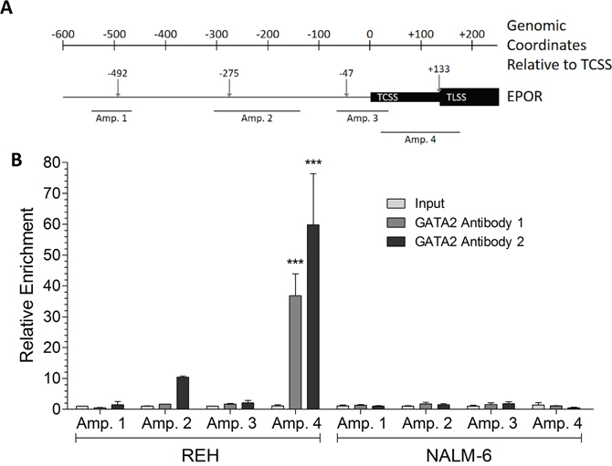 EPOR is tightly regulated in erythroid cells, mainly by GATA1 which is expressed at low levels in B-cell precursors. To investigate whether other members of the GATA family are involved in the expression of EPOR, we evaluated the expression of each GATA family member in the three model cell lines. GATA4, GATA5 and GATA6 were very weakly expressed in REH and NALM-6 cells, and conversely GATA3 was highly expressed in both cell lines. However, GATA2 was significantly (p < 0.001) differentially expressed, with higher levels in REH than in NALM-6 cells (Figure 1C). Western blot analysis indicated that GATA2 protein levels were also higher in REH than NALM-6 cells (Figure 1D). OCI-AML3 was selected as a negative control to check EPOR expression in a non-ALL leukemic cell line. Results from the Affymetrix datasets confirm that EPOR is substantially higher in UT-7 and REH cells than in NALM-6 and OCI-AML-3 (Supplementary Figure 2).