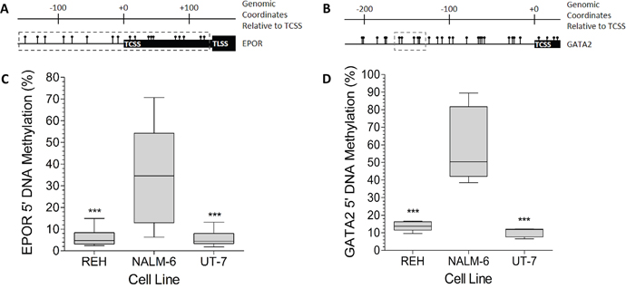 Decitabine caused significant demethylation of 15 of the 18 CpG sites analyzed on the EPOR promoter in NALM-6 cells, but this did not lead to increased EPOR expression. Similarly, Decitabine reduced an already low level of methylation of the EPOR promoter in REH cells, but did not cause increased EPOR expression. Decitabine caused significant reductions in methylation of all five CpG sites analyzed in the GATA2 promoter in both NALM-6 and REH cells and led to increased GATA2 expression in both cell lines.