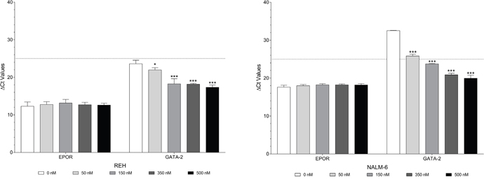 Figure 5: Decitabine causes demethylation of both EPOR and GATA2 but only increases expression of GATA2. EPOR and GATA2 expression in REH and NALM-6 cells after treatment with 50 to 500 nM Decitabine. Expression values were corrected to 18S ribosomal RNA levels. Mean corrected Ct values (±SD) are shown. Statistical differences compared to the control (0 nM Decitabine) are indicated by * (p < 0.05), ** (p < 0.01), or *** (p < 0.001) were calculated with the two-way ANOVA with Holm Sidak correction.