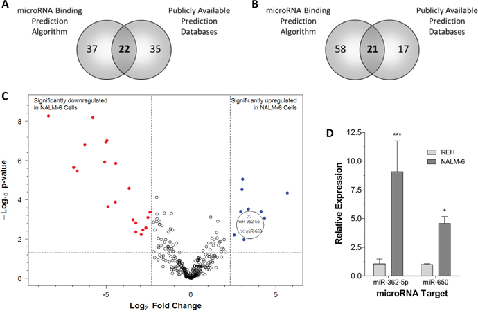 Figure 6: Expression of microRNAs predicted to target EPOR and GATA2 are increased in NALM-6 cells. (A) Venn diagram showing consensus between an in silico microRNA targeting algorithm [45] and publicly available prediction databases. MicroRNAs predicted to target EPOR were selected and overlapped. (B) Venn diagram showing consensus between an in silico microRNA targeting algorithm [45] and publicly available prediction databases. MicroRNAs predicted to target GATA2 were selected and overlapped. (C) Volcano plot of the differential expression of microRNAs between REH and NALM-6 cells and the associated nominal p-value. The expression of 670 microRNAs was analyzed in REH and NALM-6 cells in triplicate by Q-PCR using multiplex assays. Expression values were corrected to the mean RNU6 and RNU44 levels. Nominal p-values associated with the fold differences compared to NALM-6 were determined using the Bioconductor package ‘limma’. Selection criteria for significantly different expression were an absolute fold change ≥5 and a nominal p-value < 0.05. (D) The differential expression of selected microRNAs (miR-362-5p and miR-650) was validated in REH and NALM-6 cells in triplicate by Q-PCR using single microRNA assays. Expression values were corrected to the mean RNU6 and RNU44 levels. Mean relative expression levels (±SD) compared to REH are shown and statistical differences to REH were detected by two-way ANOVA and are indicated by * (p < 0.05) or *** (p < 0.001).