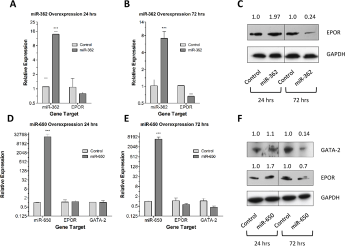 miRNAs which were significantly differentially expressed between REH and NALM-6 cells were compared to those predicted by miRecords and Pareto Front analysis to identify those likely to cause down-regulation of EPOR and GATA2. Overexpression of miR-362 caused down-regulation of EPOR protein levels. Similarly, overexpression of miR-650 caused down-regulation of both GATA2 and EPOR, providing further evidence for a functional relationship between GATA2 and EPOR.