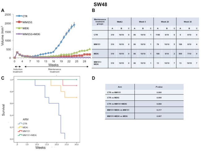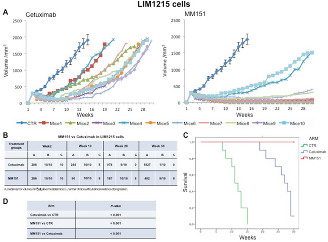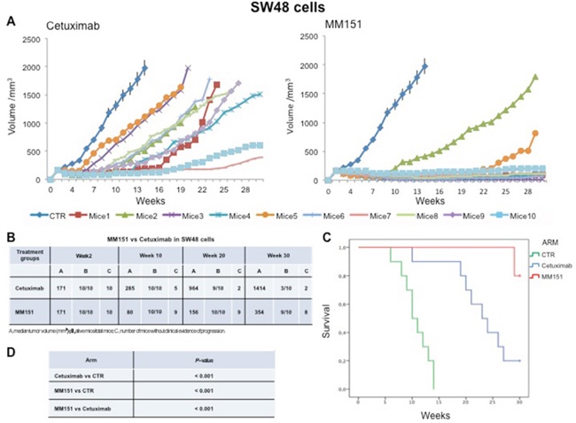 Four- to six-week old female balb/c athymic (nu+/nu+) mice were purchased from Charles River Laboratories (Milan, Italy). The research protocol was approved and mice were maintained in accordance with the institutional guidelines of the Università degli Studi della Campania L. Vanvitelli Animal Care and Use Committee. Animal care was in compliance with Italian (Decree 116/92) and European Community (E.C. L358/1 18/12/86) guidelines on the use and protection of laboratory animals. Mice were acclimatized at the Second University of Naples Medical School Animal Facility for 1 week prior to being injected with cancer cells and then caged in groups of five. We have conduct three different experimental design to evaluate the in vivo activity of MM151. In the first one, 3,5 x 106 SW48 or CACO2 cells, or 2 x 106 LIM 1215 cells were suspended in 200 μl of Matrigel (BD Biosciences, Milan, IT): PBS (1:1) and were subcutaneously injected to the right flank of mice. When the mean values of tumors were between 200-300 mm3, mice were randomly assigned to one of the following groups (ten mice per group): group 1: vehicle, administrated intraperitoneally (i.p.); group 2: cetuximab, injected once a week i.p. at the dose of 25 mg/Kg; Group 3: MM151, injected once a week i.p. at total dose of 25 mg/Kg. Monitoring of tumor growth was performed until tumors reached approximately 2.000 mm3, when mice were euthanized. The treatment was continued for 30 weeks. In the second experiment, groups of 40 mice each were injected subcutaneously with SW48, LIM 1215 or CACO2 colon cancer cells. After two weeks, animals were treated with irinotecan (100 mg/kg once a week, i.p.) plus MM151 (induction therapy). At the end of three weeks of therapy, mice were randomized into 4 groups (n=10 mice per group): group 1: vehicle, administrated i.p.; group 2: MEKi administrated by oral gavage at dose of 25mg/kg, every day for 5 days a week; group 3: MM151, administrated i.p.; group 4: combination of MM151 plus MEKi. This maintenance treatment was continued up to 30 weeks after cancer cell injection. Finally, in the third experiment, three groups of 7 mice each were injected subcutaneously with SW48, LIM1215 or CACO2 cells. Tumors were allowed to grow to 200-300 mm3 and mice were treated with cetuximab once a week by i.p. injection. Treatment was continued until disease progression. At progression each mouse was assigned to MM151 treatment. MM151 was administered as above described. The treatment was continued up to 30 weeks after cancer cell injection. In all experiments, mice body weights were monitored daily. Tumor size was evaluated twice a week by calliper measurements using the following formula: π/6 x larger diameter x (smaller diameter)2. For assessment of tumor response to treatment, we used volume measurements and adopted a classification methodology loosely inspired by clinical criteria: (i) tumor regression (or shrinkage) was defined as a decrease of at least 50% in the volume of target lesions, taking as reference the baseline tumor volume; (ii) at least a 35% increase in tumor volume identified disease progression; and (iii) responses that were neither sufficient reduction to qualify for shrinkage or sufficient increase to qualify for progression were considered as disease stabilization.