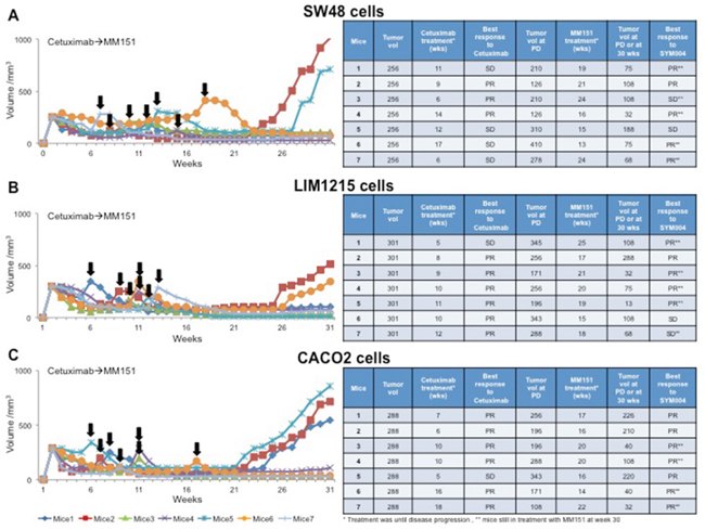 Figure 4: Effect of MM151 treatment after progression to cetuximab therapy in SW48, LIM1215 and CACO2 tumor xenografts. (A-C) SW48, LIM1215 or CACO2 human colon cancer cells were injected subcutaneously into the right flank of seven nude mice, respectively. After two weeks mice were treated with cetuximab (25 mg/Kg once a week) by i.p. injection. Treatment was continued until disease progression. The black arrows indicate the time of progression to cetuximab. At progression mice were treated with MM151 (25 mg/Kg once a week) by i.p. injection. The treatment was continued until 30 weeks following tumor cell injection. At week 30, five out of seven mice were still on treatment with MM151 in the SW48 and LIM1215 xenograft groups as well as four out of seven in the CACO2 xenograft group (as indicated by double asterisk). Abbreviations: PD, progression disease; PR, partial response; SD, stable disease; wks, weeks.