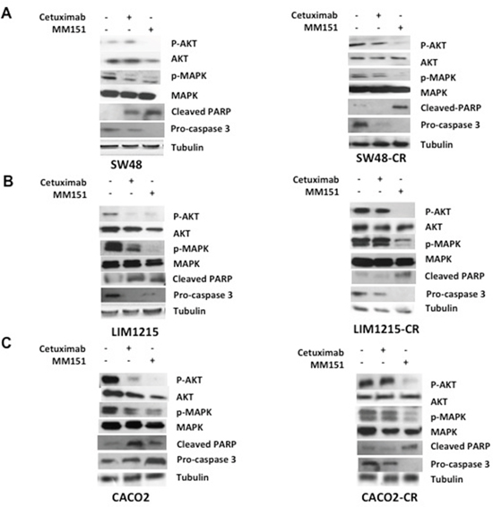 Figure 8: Effects of cetuximab and MM151 on EGFR-dependent intracellular signaling pathways and on apoptosis process in human colorectal cancer xenograft models. (A-C) Tumors were collected at the beginning of cetuximab treatment and at the onset of resistance to cetuximab from mice engrafted with the SW48, LIM1215 and CACO2 cell lines. As control we used one mouse that has not undergone to any type of treatment from the first in vivo experiment. Tumour samples were collected and total cell protein extracts were subjected to immunoblotting with the indicated antibodies, as described in Materials and Methods. Anti-tubulin antibody was used for normalization of protein extract content.
