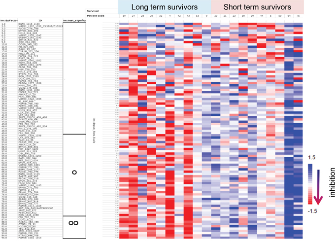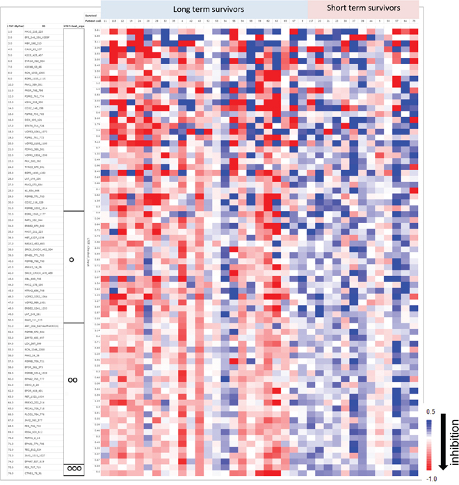 Figure 3: Colour map representation of gefitinib-induced tyrosine phophorylation inhibition in peptide profiles obtained with the combined 37 patients described in Figures 1 and 2. Patient samples are sorted in columns according to their survival status. Rows represent the peptides sorted according to their correlation with survival status. As depicted in the colour bar scale, a red colour indicates a relatively high “inhScor” value, a Log2-transformed ratio of tyrosine phosphorylation inhibition by gefitinib. The significance obtained in the t test per peptide is indicated on the left side of the figure using the following coding: OOO, p < 0.001; OO, p < 0.01; O, p < 0.05; p ≥ 0.05 otherwise.