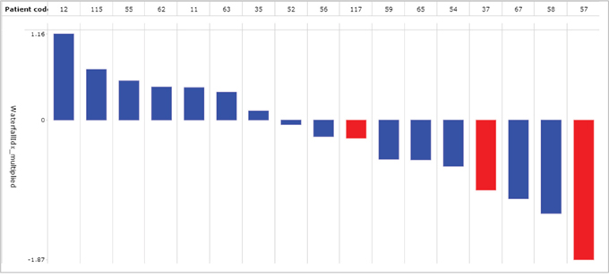 Figure 4: PLS-DA class prediction for TNM stage 1 LuAdCa performed with the 76 selected peptides. Predictive performance was examined using PLS-DA and 10-fold cross-validation. Of the combined 37 patients described in Figures 1 and 2, we obtained an accuracy of 27/37 (73%) of proper classification. The predicted class is indicated by the prediction score (y-axis), where a prediction score > 0 indicates a long-term survivor, and prediction score < 0 indicates a short-term survivor. The known class is indicated by plain or dashed blue-coded bars for long-term and plain or dashed red-coded bars for the short term survivors. Prediction performance, which is situated further away from the decision boundary set at 0, is less likely to belong to the opposite group. We randomly tested 13 patients (plain colour bars) for EGFR mutations, and 11 of them for EGFR amplification (patients #4 and #43 were not tested). We found that 30% (4/11) of the LuAdCa resection specimens had either mutated (triangle) and/or amplified EGFR (star).