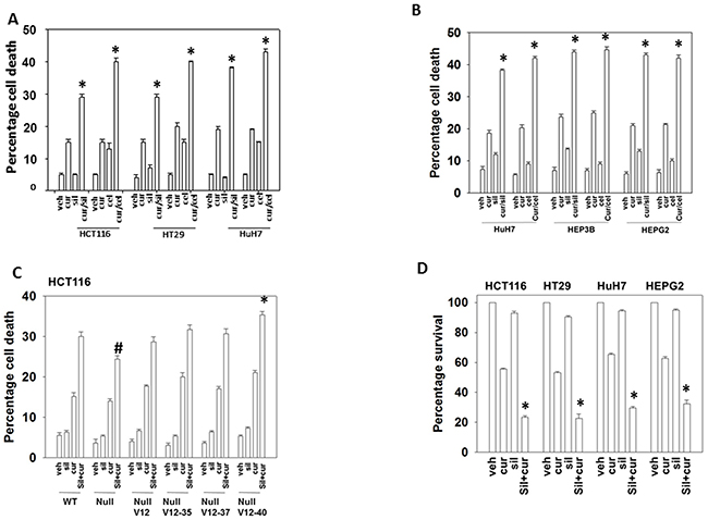 Figure 1: Curcumin interacts with sildenafil and with celecoxib to kill GI tumor cells. (A) Colon cancer cells and (B) liver cancer cells were treated with vehicle control, curcumin (2.0 μM), sildenafil (2.0 μM), celecoxib (2.0 μM) or the drugs in the indicated combinations for 24h. Cell death was measured by trypan blue exclusion (n = 3 +/-SEM) * p < 0.05 greater than individual drug treatments. (C) HCT116 cells (parental wild type; K-RAS D13 deleted, C2; C2 cells transfected to express H-RAS V12, C10; C2 cells transfected to express H-RAS V12 C10-35 that activates the ERK1/2 pathway; C2 cells transfected to express H-RAS V12 C10-37 that activates RAL GDS; C2 cells transfected to express H-RAS V12 C10-40 that activates the PI3K pathway) were treated for 12h with vehicle control or with sildenafil (2.0 μM) and/or curcumin (2.0 μM), alone or in combination as indicated. Cell death was measured by trypan blue exclusion (n = 3 +/-SEM) * p < 0.05 greater killing than corresponding value in wild type; #p < 0.05 less killing than corresponding value in wild type. (D) Tumor cells as single cells were plated (250-1,000 cells / 60 mm dish). Cells were permitted to attach for 24h after which cells were treated for 24h with vehicle, curcumin (2.0 μM), sildenafil (2.0 μM) or the drugs in combination. After 24h the cells were washed in drug free media and cultured for ~10 days in drug free media. Colony formation (> 50 cells / colony) was determine for each condition and the plating efficiency determined and plotted (n = 6 +/- SEM). * p < 0.05 less than curcumin single agent.
