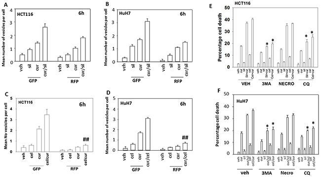 Figure 4: Curcumin and sildenafil increase autophagosome and autolysosome levels that is causal in tumor cell killing. (A) HCT116 cells and (B), HuH7 cells, were transfected with a plasmid to express LC3-GFP-RFP. Twenty-four h later cells were treated for 6h with vehicle, curcumin (2.0 μM), sildenafil (2.0 μM) or the drugs in combination. At each time point cells were microscopically examined at 40X for the presence of punctate green and red vesicles in at least 40 cells. The mean number of vesicles per cell is plotted (n = 3 +/-SEM). (C) HCT116cells and (D) HuH7cells were transfected with a plasmid to express LC3-GFP-RFP. Twenty-four h later cells were treated for 6h with vehicle, curcumin (2.0 μM), celecoxib (2.0 μM) or the drugs in combination. At each time point cells were microscopically examined at 40X for the presence of punctate green and red vesicles in at least 40 cells. The mean number of vesicles per cell is plotted (n = 3 +/-SEM). ## p < 0.05 less than corresponding value in cur/sil treated cells in Panels (A) and (B). (E) HCT116 cells and (F). HuH7 cells, were treated for 24h with vehicle, curcumin (2.0 μM), sildenafil (2.0 μM), celecoxib (2.0 μM) or the drugs in combination. Where indicated the groups of cells were treated with vehicle control, 3-methyl adenine (10 μM); necrostatin (1 μM) or chloroquine (1 μM). Cell death was measured by trypan blue exclusion (n = 3 +/-SEM) * p < 0.05 less killing than corresponding value in vehicle.