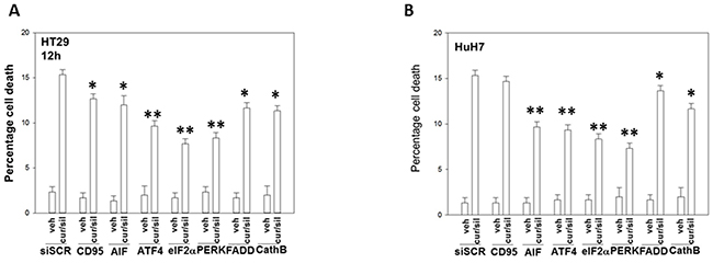 Figure 6: Endoplasmic reticulum stress signaling induced by [curcumin + sildenafil] through PERK-eIF2α causes tumor cell death. (A) Colon tumor cells and (B) liver tumor cells were transfected with a scrambled siRNA control or with siRNA molecules to knock down the expression of: CD95; AIF; ATF4; eIF2α; PERK; FADD; and cathepsin (B). Twenty-four h after transfection cells were treated with vehicle control or with [curcumin (2.0 μM) + sildenafil (2.0 μM)] for 12h. Cell death was measured by trypan blue exclusion (n = 3 +/-SEM). * p < 0.05 less than corresponding value in siSCR cells; ** p < 0.01 less than corresponding value in siSCR cells.