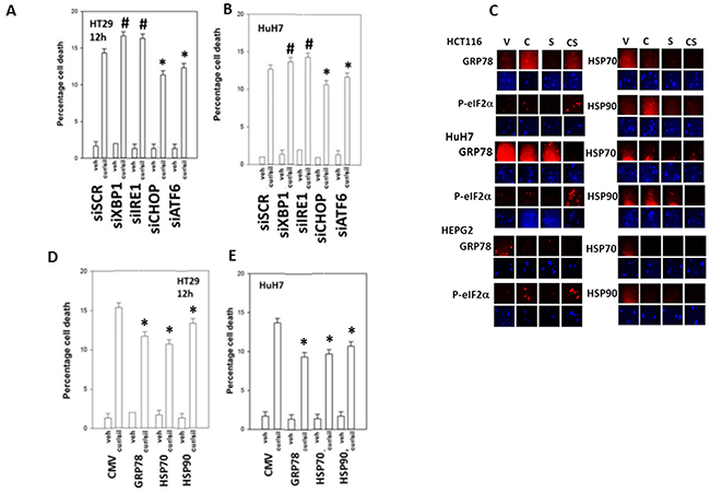 Figure 7: PERK- and ATF6- dependent signaling facilitates [curcumin + sildenafil] toxicity whereas IRE1/XBP1 signaling via chaperone expression is protective. (A-B) Tumor cells were transfected with a scrambled siRNA control or with siRNA molecules to knock down the expression of: XBP1; IRE1; CHOP; or ATF6. Twenty-four h after transfection cells were treated with vehicle control or with [curcumin (2 μM) + sildenafil (2 μM) for a further 12h. Cell death was measured by trypan blue exclusion (n = 3 +/-SEM). # p < 0.05 greater than corresponding value in siSCR cells; * p < 0.05 less than corresponding value in siSCR cells. (C) Tumor cells were treated with vehicle control; curcumin (2 μM); sildenafil (2 μM) or the drugs in combination for 6h. Cells were fixed in situ and immuno-fluorescence at 10X performed to determine the expression levels of HSP90, HSP70, GRP78 and the serine 51 phosphorylation of eIF2α. (D-E) Tumor cells were transfected with an empty vector plasmid (CMV) or plasmids to express: GRP78; HSP90; or HSP70. Twenty-four h after transfection cells were treated with vehicle control or with [curcumin (2 μM) + sildenafil (2 μM) for a further 12h. Cell death was measured by trypan blue exclusion (n = 3 +/-SEM). * p < 0.05 less than corresponding value in siSCR cells.