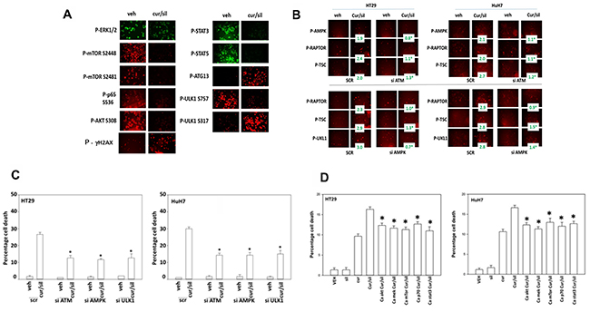 Figure 8: [Curcumin + sildenafil] treatment inactivates multiple cyto-protective signaling pathways. (A) Tumor cells were treated with vehicle control or with [curcumin (2 μM) + sildenafil (2 μM) for a further 6h. Cells were fixed in place and immuno-fluorescence performed to determine the expression and/or phosphorylation of the indicated proteins. Cells were visualized in a Hermes wide field microscope at 10X magnification. (B) Upper: Tumor cells were transfected with a scrambled siRNA (siSCR) or an siRNA to knock down expression of ATM. Twenty-four h after transfection cells were treated with vehicle control or with [curcumin (2 μM) + sildenafil (2 μM) for a further 6h. Cells were fixed in place and immuno-fluorescence performed to determine the expression and/or phosphorylation of the indicated proteins. (n = 3 +/-SEM) * p < 0.05 less than corresponding value in SCR cells. Lower: Tumor cells were transfected with a scrambled siRNA (siSCR) or siRNA to knock down expression of AMPKα. Twenty-four h after transfection cells were treated with vehicle control or with [curcumin (2 μM) + sildenafil (2 μM) for a further 6h. Cells were fixed in place and immuno-fluorescence performed to determine the expression and/or phosphorylation of the indicated proteins. (n = 3 +/-SEM) * p < 0.05 less than corresponding value in SCR cells. (C) Tumor cells were transfected with a scrambled siRNA (siSCR) or siRNA to knock down expression of AMPKα, ATM or ULK-1. Twenty-four h after transfection cells were treated with vehicle control or with [curcumin (2 μM) + sildenafil (2 μM) for a further 24h. Cell death was measured by trypan blue exclusion (n = 3 +/-SEM) * p < 0.05 less than corresponding value in SCR cells. (D) Tumor cells were transfected with an empty vector plasmid (CMV) or plasmids to express: activated AKT; activated MEK1; activated mTOR; activated p70 S6K; and activated STAT3. Twenty-four h after transfection cells were treated with vehicle control or with [curcumin (2 μM) + sildenafil (2 μM) for a further 12h. Cell death was measured by trypan blue exclusion (n = 3 +/-SEM). * p < 0.05 less than corresponding value in CMV cells.