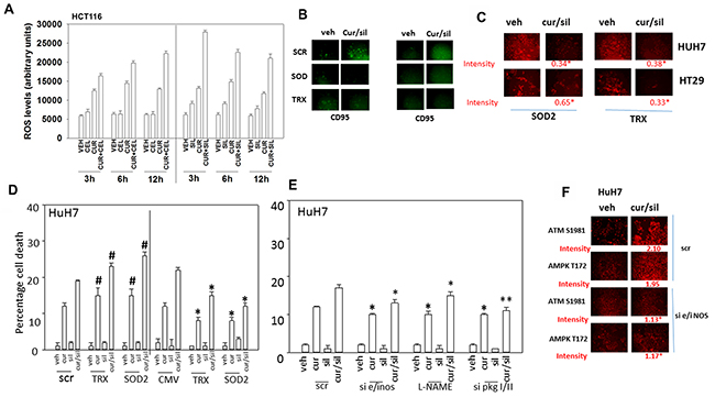 Figure 9: Reactive oxygen / nitrogen species and the suppression of their detoxification by [curcumin + sildenafil] treatment plays a major role in drug combination toxicity. (A) HCT116 cells were treated with vehicle control, curcumin (2 μM), sildenafil (2 μM) or celecoxib (2 μM) alone or in combination as indicated for the times as shown in the graph (3h, 6h, 12h). Fifteen min prior to assessment of ROS levels, HCT116 cells were pre-incubated with the dye DCFH-DA (5 μM). At each time point cells were placed into a Vector 3 plate reader and the fluorescence of converted DCFH-DA measured (n = 3 +/-SEM). * p < 0.05 greater than corresponding value in cells treated with [curcumin + celecoxib]. (B) Tumor cells were transfected with an empty vector plasmid (CMV) or with plasmid to express either TRX or SOD2. Twenty-four h after transfection cells were treated with vehicle control or with [curcumin (2 μM) + sildenafil (2 μM)] in combination for 2h. Cells were fixed in place and not permeabilized. Immuno-staining was performed to determine the total cell surface fluorescence of CD95 staining under each condition (n = 3 +/- SEM). (C) Tumor cells were treated with vehicle control, curcumin (2 μM), sildenafil (2 μM) alone or in combination for 6h. Cells were fixed in place and immuno-fluorescence performed to determine the expression of SOD2 and TRX, and the phosphorylation of ATM, AMPK and eIF2α (n = 3 +/-SEM) * p < 0.05 less than value in VEH cells. (D) Tumor cells were either transfected with a scrambled siRNA (siSCR) or siRNA molecules to knock down expression of SOD2 or TRX, alternatively other portions of cells were transfected with an empty vector plasmid (CMV) or with plasmids to express SOD2 or TRX. Twenty-four h after transfection cells were treated with vehicle control or [curcumin (2 μM) + sildenafil (2 μM)] in combination for 24h. Cell death was measured by trypan blue exclusion (n = 3 +/-SEM). * p < 0.05 less than corresponding value in CMV cells; # p < 0.05 greater than corresponding value in siSCR cells. (E) Tumor cells were transfected were either transfected with a scrambled siRNA (siSCR) or siRNA molecules to knock down expression of: [iNOS + eNOS] or [PKGI + PKGII]. Twenty-four h after transfection cells were treated with vehicle control or [curcumin (2 μM) + sildenafil (2 μM)] in combination for 24h. Cell death was measured by trypan blue exclusion (n = 3 +/-SEM). * p < 0.05 less than corresponding value in CMV cells; ** p < 0.05 less than corresponding value in L-NAME treated cells. (F) Tumor cells were transfected either with a scrambled siRNA (siSCR) or siRNA molecules to knock down expression of [iNOS + eNOS]. Tumor cells were treated with vehicle control or [curcumin (2 μM) + sildenafil (2 μM)] alone or in combination for 6h. Cells were fixed in place and immuno-fluorescence performed to determine the phosphorylation of ATM S1981 and AMPK T172 (n = 3 +/-SEM) * p < 0.05 less than corresponding value in SCR cells.