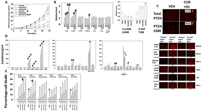 Figure 10: Curcumin combines with sildenafil to reduce tumor growth, an effect that is enhanced by celecoxib. (A) CT29 cells were implanted into the rear flank of mice and tumors permitted to form (~45 mm3). Animals were grouped with the mean tumor volume of each group being very similar. Animals were then treated for 5 days with curcumin, sildenafil and/or celecoxib as described in the Methods. Tumors were callipered and tumor volumes determined before and following drug exposure (n = 10 +/- SEM) * p < 0.05 less than curcumin alone; ** p < 0.05 less than [curcumin + sildenafil]. (B) At the time of animal nadir when tumor volumes were approaching 1,500 mm3, tumors were isolated, homogenized and processed according to manufacturer’s instructions to determine the expression and phosphorylation of the indicated proteins. # p < 0.05 greater than corresponding value in vehicle control cells; ## p < 0.05 greater than value in cur+sil material; * p < 0.05 less than vehicle control value; ** p < 0.05 less than value in curcumin only treated cells. (C) CT26 cells isolated from vehicle control treated tumors and [curcumin + sildenafil] treated tumors were plated and 24h later fixed in situ. Immunofluorescence was performed in each isolate to determine the total expression of PTEN and the phosphorylation of PTEN S380. # p < 0.05 greater mol/mol phosphorylation. (D) At the time of animal nadir when tumor volumes were approaching 1,500 mm3, mouse plasma was isolated and processed according to manufacturer’s instructions to determine the plasma levels of human cytokines. * p < 0.05 less than corresponding value in vehicle control treated animals; # p < 0.05 greater than corresponding value in vehicle control cells. (E) CT26 cells isolated from vehicle control treated tumors and [curcumin + sildenafil] treated tumors were plated and 24h later were treated with vehicle control, [curcumin (2.0 μM) + sildenafil (2.0 μM)], regorafenib (0-2.0 μM), pazopanib (0-2.0 μM), ruxolitinib (0-2.0 μM) or the drugs in combination as indicated for 12h. Cell death was measured by trypan blue exclusion (n = 3 +/-SEM). * p < 0.05 less than corresponding value in control tumor cells; ¶ p > 0.05 compared to corresponding value in control tumor cells.
