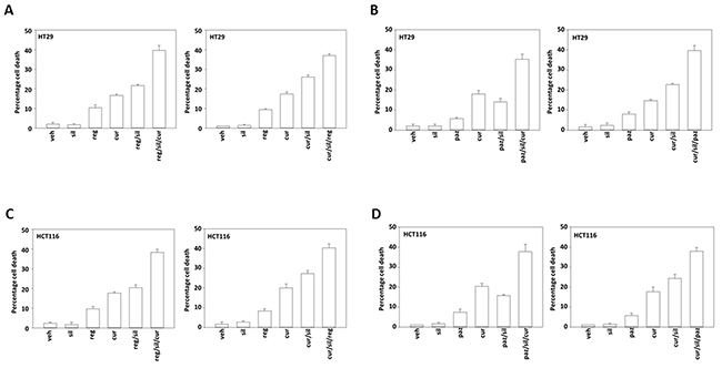 Figure 11: Regorafenib and pazopanib both enhance [curcumin + sildenafil] lethality in colon cancer cells. (A-D) Colon cancer cell lines were treated with vehicle control, [curcumin (2.0 μM) + sildenafil (2.0 μM)], regorafenib (1.0 μM), pazopanib (1.0 μM) or the drugs in combination as indicated in each graph for 12h. Cell death was measured by trypan blue exclusion (n = 3 +/-SEM).