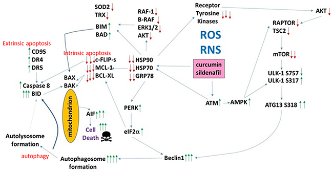 Figure 12: The molecular pathways by which curcumin and sildenafil interact to kill tumor cells. Exposure to [curcumin + sildenafil] increases the levels of ROS and RNS in tumor cells which plays a role in mediating DNA damage and reduced expression of multiple chaperones. This, in turn, leads to inactivation of cyto-protective signaling pathways and downstream to reduced expression of protective proteins such as MCL-1, BCL-XL, SOD2 and TRX. GRP78 down-regulation permits ER stress signaling to reduce transcription of protective proteins and to stimulate production of Beclin1. DNA damage signaling from ATM through the AMPK promotes inactivation of mTOR and activation of ULK-1 which through ATG13 stimulates autophagosome production – the elevated Beclin1 levels interact with this signal to produce autophagic flux and autolysosome production. ROS/RNS production facilitates CD95 activation that in coordination with cathepsin B from the lysosomes causes BID cleavage, mitochondrial dysfunction and cell death executed by AIF.