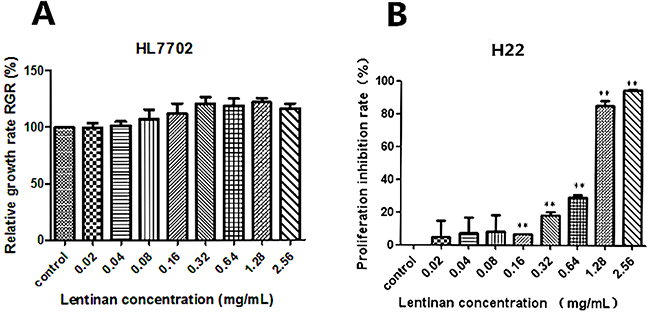 Figure 1: Effects of lentinan on cytotoxicity in vitro. Human normal liver cell line HL7702 and murine liver cancer cell line H22 were treated with different concentrations of lentinan (0.02, 0.04, 0.08, 0.16, 0.32, 0.64, 1.28 and 2.56 mg/mL) for 24 h. The relative growth rate (RGR, %) of HL7702 cells and proliferation inhibition rate of H22 cells were tested. (A) The relative growth rate (RGR, %) of HL7702 cells treated with different concentrations of lentinan. (B) The proliferation inhibition rate of H22 cells treated with different concentrations of lentinan. The asterisks represent statistical significance (*P < 0.05 and **P < 0.01) compared with the control value.
