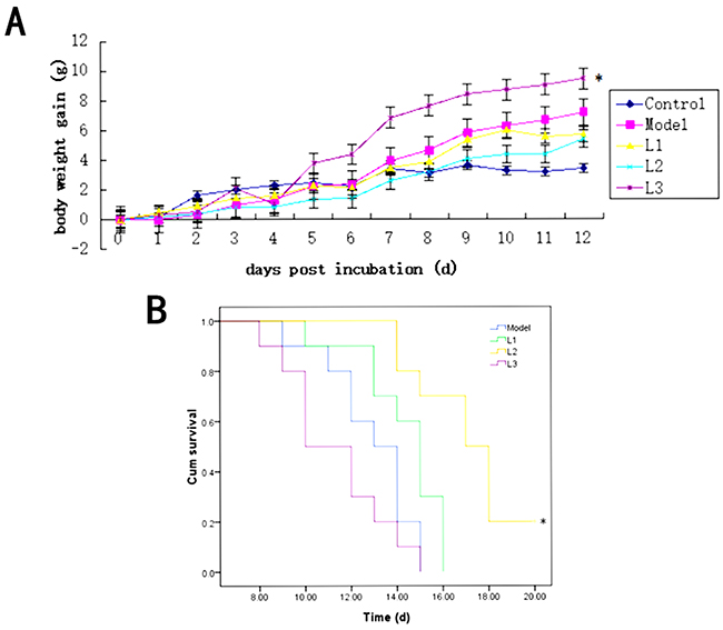 The variation rates of the average body weight of the mice in L1 and L2 groups were between that of the control and model groups. The increase of the average mouse body weight in L3 group was higher than that of the model group (P<0.05). After four days, mouse body weight in L3 group showed significant increased compared to control group, while there was no significant difference in the other groups. The increase velocity of the average mouse body weight in other groups were model >L1 >L2 >control group from day 8 to 12 (Figure 2A). As shown in Figure 2B, the survival rate (20%) of the mice in L2 group was the highest among all the experimental groups, while the survival rates in other groups (L1 and L3 groups) were zero.