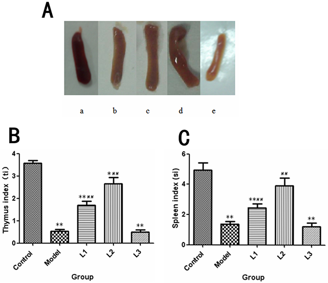 Figure 3: The changes in immune organs in each group. L1, the concentration of lentinan was 0.02mg/kg body weight; L2, the concentration of lentinan was 0.4mg/kg body weight; or L3, the concentration of lentinan was 1mg/kg body weight. (A) The appearance of the spleen in each group of mice was recorded. a: control group, b: model group, c: L1 group, d: L2 group, e: L3 group. (B) ti (thymus index) of each group was tested. (C) si (spleen index) of each group was tested. *P<0.05 vs control, **P<0.01 vs control, #P < 0.05 compared to model, ##P < 0.01 compared to model.