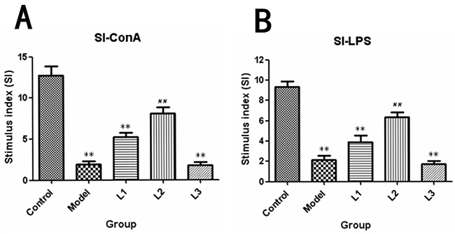 The SI (stimulation index) of each group was shown in Figure 4. It was showed that the proliferation rate of spleen lymphocytes in L3 group (SI-ConA, 1.8; SI-LPS, 1.7) was remarkably depressed compared to that of control group (P<0.01). While for the mice L2 group, which was treated with 0.4mg/kg body weight of soluble lentinan, showed a significant improvement in both T-cell (SI-ConA, 8.1) and B-cell (SI-ConA, 6.37) proliferation rate compared to that of model group (P<0.01).