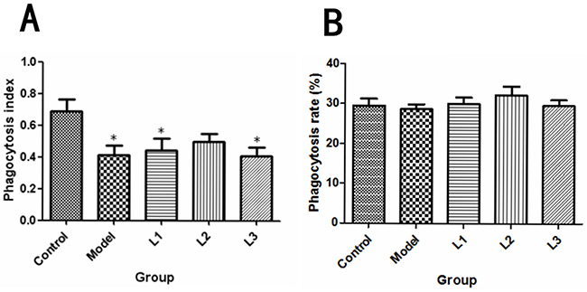 Figure 5: Effects of lentinan on mice peritoneal macrophage phagocytosis. L1, the concentration of lentinan was 0.02mg/kg body weight; L2, the concentration of lentinan was 0.4mg/kg body weight; and L3, the concentration of lentinan was 1mg/kg body weight. (A) Macrophage phagocytosis rate of each group (control, model, L1, L2, and L3) was calculated. (B) Macrophage phagocytosis index of each group (control, model, L1, L2, and L3) was tested. *P<0.05 vs control group.