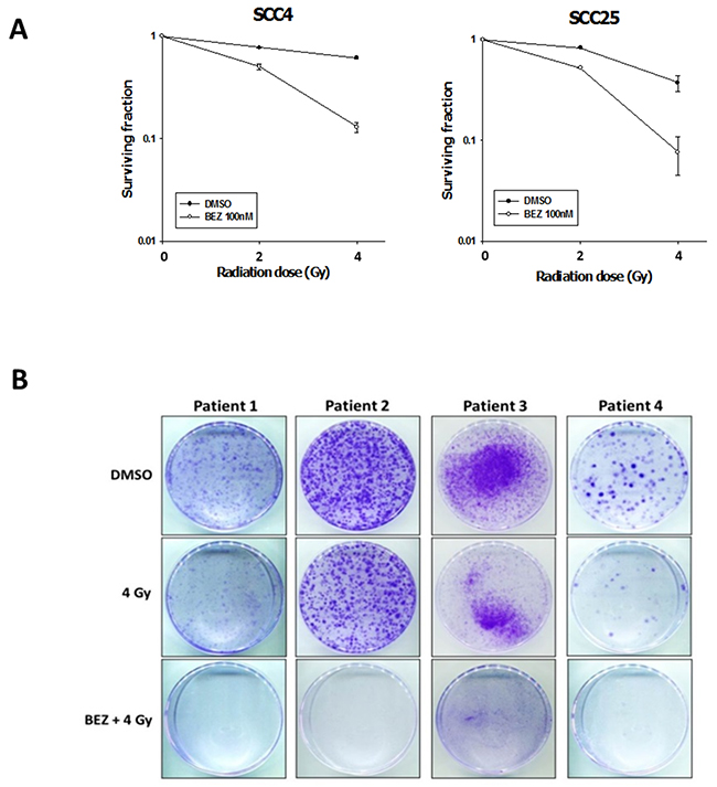 Figure 2: The dual PI3K/mTOR inhibitor enhances the radiosensitization of OSCC cells and patient-derived cells. Effect of BEZ235 and IR on OSCC colony formation. (A) SCC4 and SCC25 cells were treated with AZD2014, IR, or the two treatments in combination to then perform a colony formation assay. Data represent the mean ± SD of three independent experiments (B) Patient-derived cells were established from four individual patients with OSCC. Typical images of colony growth for the different treatments are shown. The clinical and pathologic characteristics of patients are listed in Table 1.