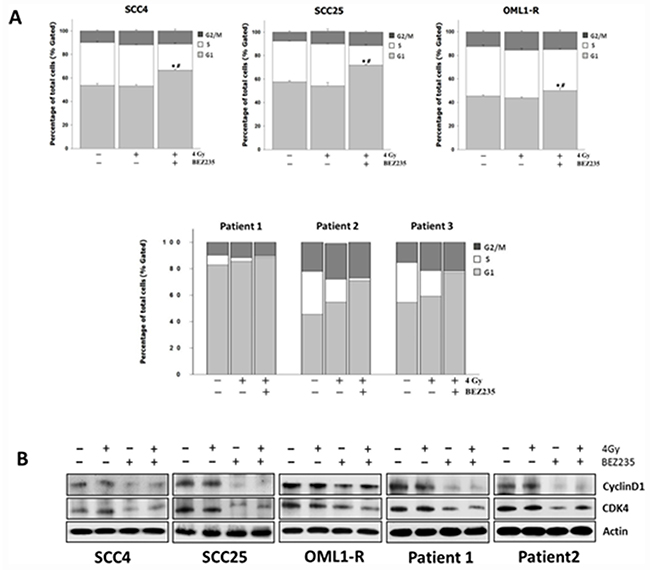 Figure 5: Combination treatment with the dual PI3K/mTOR inhibitor and IR causes G1 cell cycle arrest in OSCC cells by regulating cell cycle-related proteins. (A) Cells were treated with BEZ235 with or without IR for 48 h. The cell cycle distributions were then evaluated. Data are representative of three independent experiments. (B) Expression of Cyclin D1 and CDK4 cell-cycle-related proteins in OSCC cells as determined by western blotting.