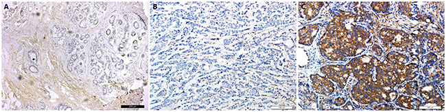 Figure 1: Immunohistochemical staining for GSTP1. (A) GSTP1 protein is absolutely negative in normal breast tissue. (Original magnification, 100× in A.) (B) GSTP1 protein showed negtive signals in triple-negative breast cancer tissues. (C) GSTP1 protein showed negtive signals in triple-negative breast cancer tissues. (Original magnification, 200× in B and C.)