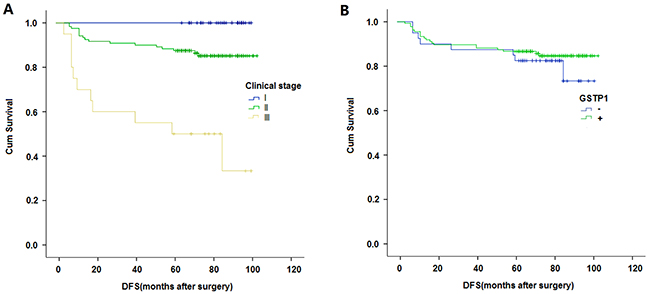 The Kaplan–Meier survival curves correlated with GSTP1 expression and clinical stage are shown in Figure 2. When including GSTP1 protein expression as an influencing factor, patients with positive GSTP1 expression showed better DFS and patients with negtive GSTP1 expression showed poorer DFS, but this was not statistically significant (P=0.437). Consistent with many other studies, patients with clinical stage 1 were found to have better DFS when compared to those with clinical stage 2, and patients with stage 2 had a better DFS than patients with stage 3 tumors (P<0.001).