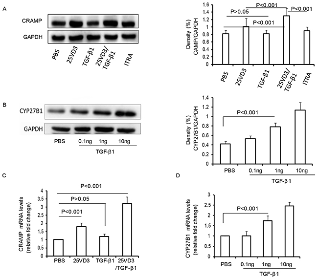 To examine the transcript levels of CRAMP genes, real time-PCR was utilized to detect the mRNA levels of CRAMP. 25VD3 increased the transcript levels of CRAMP compared to PBS-treated 16HBE cells (Figure 7C, p<0.001), but the transcript levels for CRAMP in TGF-β1-treated 16HBE cells were unaltered, compared with PBS-treated 16HBE cells (Figure 7C, p>0.05). It was interesting that the CRAMP transcript was significantly increased in TGF-β1/25VD3-treated 16HBE cells compared to 25VD3-treated 16HBE cells (Figure 7C, p<0.001). The transcript levels of CYP27B1 was also an increased in a dose-dependent manner (Figure 7D). Taken together, these findings demonstrated that TGF-β1 did not directly increase CRAMP expression, and CYP27B1 play a key role in TGF-β1-induced CRAMP expression in vitro.