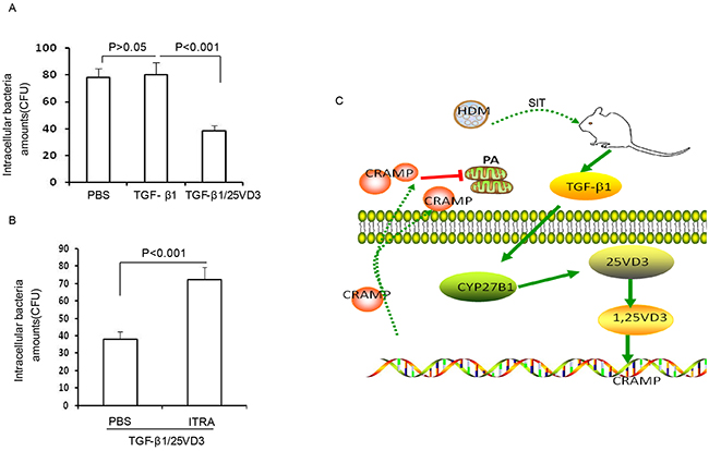 Figure 8: TGF-β1 increases defense against bacteria by CYP27B1-dependent activation. (A) 16HBE cells were pretreated with TGF-β1 and TGF-β1/25VD3. (B) 16HBE cells were pretreated with ITRA. The cells infected with P. aeruginosa cells were lysed and plated to confirm the presence of intracellular bacteria. Results are representative of three experiments and data are shown as means±SDEV. One-way ANOVA for group comparisons. Significant differences in the mean values were defined as p < 0.05. (C) Schematic representation of TGF-β1 induced CYP27B1 role in HDM immunotherapy increasing defense against P. aeruginosa during allergic airway inflammation.