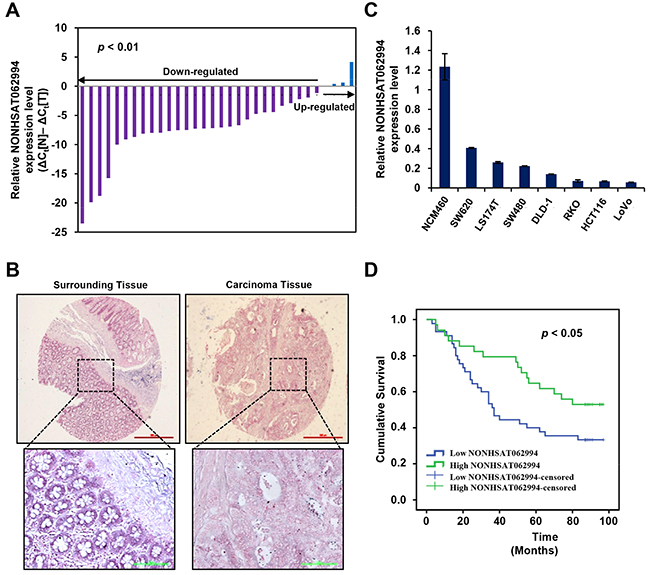 Figure 1: NONHSAT062994 levels are decreased in CRC tissues and are correlated with poor clinical outcome. (A) NONHSAT062994 expression in 32 CRC samples was evaluated by qPCR. (B) ISH for NONHSAT062994 in paraffin-embedded CRC tissues. (C) qPCR for NONHSAT062994 expression in seven CRC cell lines and a normal human colon mucosal epithelial cell line. (D) Kaplan-Meier survival curve of CRC patients with low (n = 49) and high (n = 37) NONHSAT062994 expression.