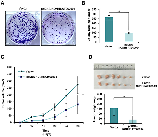Figure 2: NONHSAT062994 overexpression impairs CRC cell proliferation in vitro and growth in vivo. (A, B) Colony formation assays were performed using control or NONHSAT062994-overexpressing HCT116 cells. Representative images are shown (A; magnification, × 1), and the relative colony numbers were counted (B). (C, D) NONHSAT062994 overexpression impairs colorectal tumorigenesis. HCT116 cells overexpressing NONHSAT062994 or vector were transplanted into nude mice. The tumor volumes were calculated every 3 days (C). Representative images of tumors and the mean tumor weight in each group are shown (D). Statistical significance was determined using two-tailed unpaired Student’s t tests. **p < 0.01.