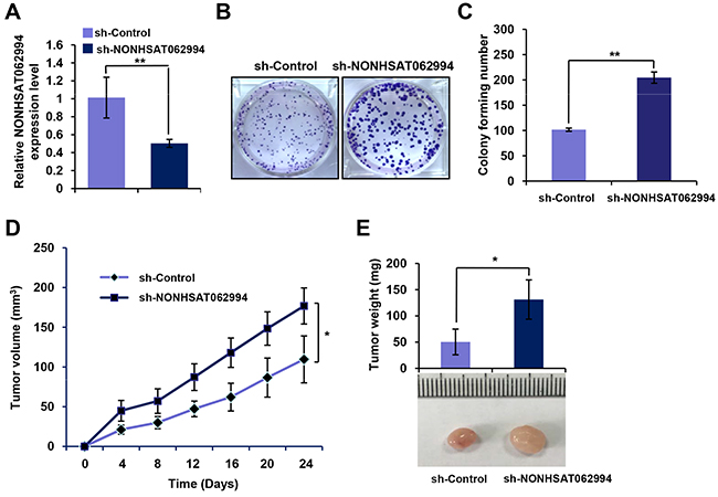 Figure 3: Knocking down NONHSAT062994 promotes CRC growth in vitro and in vivo. (A) qPCR for NONHSAT062994 expression in wild-type CRC cells (shRNA/Control) and CRC cells with stable knockdown of NONHSAT062994 (shRNA/NONHSAT062994). (B, C) Colony formation assays were performed in shRNA/Control or shRNA/NONHSAT062994 CRC cells. Representative images are shown (B; magnification, × 1), and the relative colony numbers were counted (C). (D, E) Effects of NONHSAT062994 knockdown on SW620 cell growth in nude mice. Tumor volumes were measured every 3 days (D). Representative tumor images and the mean tumor weight in each group are shown (E). Statistical significance was determined using two-tailed, unpaired Student’s t tests. **p < 0.01.