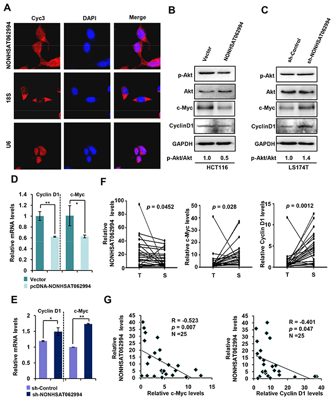 Figure 4: NONHSAT062994 inactivates Akt signaling. (A) Confocal FISH images showing that NONHSAT062994 (red) was primarily located in the cytoplasm of HCT116 cells. Nuclei were stained with DAPI (blue). Representative images are shown (magnification, ×400). (B) NONHSAT062994 overexpression decreased the levels of phosphorylated Akt, c-Myc and Cyclin D1. HCT116 cells were transfected with vector or NONHSAT062994, and total cell lysates analyzed using western blotting to determine phosphorylated Akt, c-Myc and Cyclin D1 levels. (C) Silencing NONHSAT062994 increased the levels of phosphorylated Akt, c-Myc and Cyclin D1. LS174T cells were transiently transfected with NONHSAT062994 siRNA, and total cell lysates were analyzed using western blotting to measure phosphorylated Akt, c-Myc and Cyclin D1 levels. (D) NONHSAT062994 overexpression inhibited c-Myc and Cyclin D1 expression. HCT116 cells were transfected with vector or NONHSAT062994, and qPCR was used to determine c-Myc and Cyclin D1 mRNA levels. Statistical significance was determined using two-tailed unpaired Student’s t tests. *p < 0.05, **p < 0.01. (E) Silencing NONHSAT062994 induces c-Myc and Cyclin D1 expression. SW620 cells were transfected with NONHSAT062994 shRNA, and qPCR was used to measure c-Myc and Cyclin D1 mRNA levels. Statistical significance was determined using two-tailed, unpaired Student’s t tests. *p < 0.05, **p < 0.01. (F) Comparison of NONHSAT062994, c-Myc, and Cyclin D1 expression in CRC tissues and paired adjacent normal tissues. Statistical significance was determined using two-tailed paired Student’s t tests. **p < 0.01. (G) Spearman’s analysis of the correlation between NONHSAT062994 and c-Myc and Cyclin D1 levels in 25 CRC tissues.
