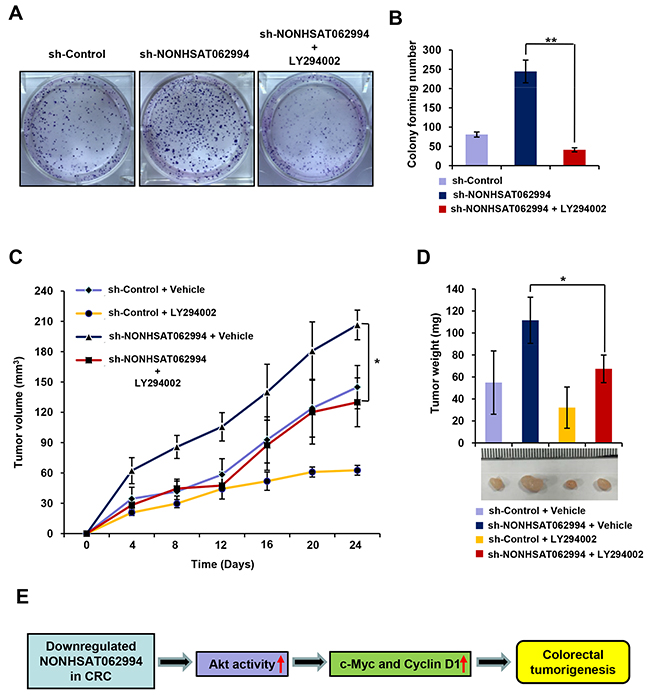 Given the evidence linking aberrant Akt activation to tumorigenesis [7], we next investigated whether Akt signaling is required for the inhibitory effects of NONHSAT062994 on CRC cell proliferation and growth. Colony formation assays revealed that LY294002, an inhibitor of Akt signaling, significantly inhibited NONHSAT062994 silencing-induced CRC cell proliferation (Figure 5A, 5B). The in vitro data were then confirmed in vivo. Treatment with LY294002 greatly reduced the size (Figure 5C) and weight (Figure 5D) of NONHSAT062994-silenced tumors to a level comparable with the control group. Taken together, these results suggest that the inhibitory effects of NONHSAT062994 on colorectal tumorigenesis are dependent on Akt signaling.