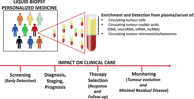 Liquid biopsy can be performed to detect circulating tumour microRNAs (miRNAs) and long non-coding RNAs (lncRNAs), circulating tumour cells (CTCs), circulating tumour DNA (ctDNA), and microvesicles/exosomes released into the blood from malignant cells. Such novel approach does not require surgical biopsy, but still provides clinicians with a wide range of information, including tumour origin, staging, patients’ response to therapy and emergence of drug resistance. By performing repeated sampling, liquid biopsy may be useful for early tumour assessment and may improve the identification of micro-metastasis and minimal residual disease, only partially detectable by conventional diagnostic methods. Notably, it may reflect the entire heterogeneity of the disease, useful for better monitoring the molecular changes within the tumour in real time [34].