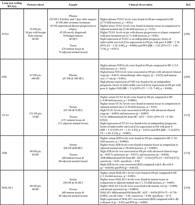 LncRNAs were reported to be involved also in OS pathogenesis, metastasis and chemoresistance. A microarray analysis explored the expression profile of lncRNAs in human primary OS and their noncancerous counterparts; the study highlighted more than 25.000 lncRNAs deregulated, with both oncogenic and tumour suppressive transcripts. Notably, lncRNAs were functional correlated with several signaling pathways implicated in OS proliferation and metastasis [106, 107]. Table 5 reports the clinical significance of circulating lncRNAs in OS.