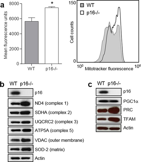 Figure 1: p16-deficient cells display increased mitochondrial mass and biogenesis. a. Mitochondrial mass. Left, wild-type (WT) and p16-/- primary fibroblasts were stained with MitoTracker-Green, and analyzed by flow cytometry. Error bars indicate SEM from triplicate determinations, *P = 0.02. Right, representative histogram. b. Western blotting for mitochondrial structural proteins in WT and p16-/- fibroblasts, with Actin as a loading control. c. Western blotting for proteins in WT and p16-/- fibroblasts that regulate mitochondrial biogenesis, with Actin as a loading control.