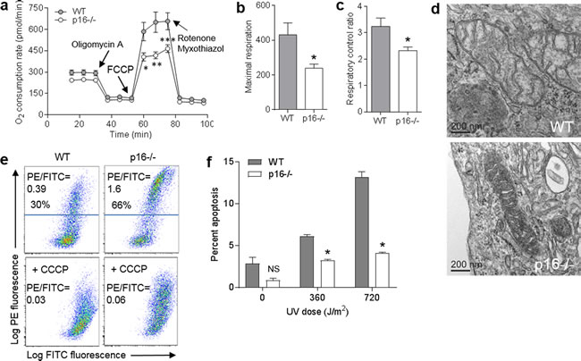Figure 2: Loss of p16 results in decreased respiration capacity and mitochondrial changes. a. Oxygen consumption rate measured in wild-type (WT) and p16-/- primary fibroblasts with timed addition of oligomycin A (1 μg/ml), FCCP (0.5 μM), and a mixture of rotenone (1 μM) and myxothiazol (1 μM). Error bars indicate SEM from 9 determinations. *P = .02, **P = .007, ***P = .01. b. Maximal respiration. Values calculated from data in a.. *P = .02. c. Respiratory control ratio. Values calculated from data in a.. *P = .03. d. Representative electron micrographs of mitochondria. Scale bar indicates 200 nm. e. WT and p16-/- fibroblasts were stained with JC-1, in the absence or presence of 50 µM CCCP. f. WT and p16-/- fibroblasts were treated with the indicated doses of UV, then assessed for apoptosis by Annexin V staining 24 h later. Error bars indicate SEM from 3 determinations. *P < .001. NS, not significant.