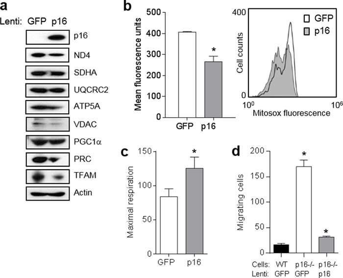 To confirm the dependence of this mitochondrial and migratory phenotype on p16, we initially expressed p16 in p16-deficient PMFs using a lentiviral approach. Compared to p16-/- cells infected with a control GFP-expressing lentivirus, similar cells infected with GFP/p16-expressing lentivirus displayed abundant levels of p16 and lower levels of several mitochondrial proteins including ND4, ATP5A and VDAC, and lower levels of the co-activators PRC and TFAM (Figure 4a). Levels of PGC1α were not affected (Figure 4a). The coincident expression of GFP precluded our ability to examine mitochondrial mass using MitroTracker-Green. Mitochondrial superoxide was also significantly reduced by forced p16 expression (Figure 4b). By contrast, mitochondrial respiration was significantly increased by p16 expression (Figure 4c). Finally, expression of p16 reduced the motility of p16-/- cells to that of WT cells (Figure 4d). Thus, forced expression of p16 in p16-/- PMFs was sufficient to reverse all of the mitochondrial and migratory phenotypes observed in p16-/- PMFs.