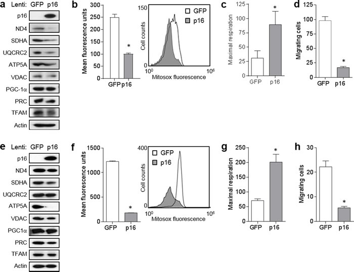 Figure 5: Forced expression of p16 modulates mitochondrial biogenesis, respiration, and motility. a. A375 human melanoma cells were infected with control (GFP) or GFP/p16-expressing lentivirus, then 6 d later lysates were subjected to Western blotting. b. Cells in a. analyzed for mitochondrial superoxide by flow cytometry. Error bars indicate SEM from duplicate determinations, *P < .001. c. Maximal respiration of cells in a.. Error bars indicate SEM from 9 determinations, *P = .04. d. A375 cells were infected with control (GFP) or GFP/p16-expressing lentivirus, then 48 h later were placed in migration assay, and migrating cells counted at 24 h. Error bars indicate SEM from triplicate determinations, *P < .001. e. Human melanocytes were infected with control (GFP) or GFP/p16-expressing lentivirus, then 6 d later lysates were subjected to Western blotting. f. Cells in e. analyzed for mitochondrial superoxide by flow cytometry. Error bars indicate SEM from duplicate determinations, *P < .001. g. Maximal respiration of cells in e.. Error bars indicate SEM from 9 determinations, *P < .001. h. Melanocytes were infected with control (GFP) or GFP/p16-expressing lentivirus, then 48 h later were placed in migration assay and migrating cells counted at 48 h. Error bars indicate SEM from triplicate determinations, *P = .003.
