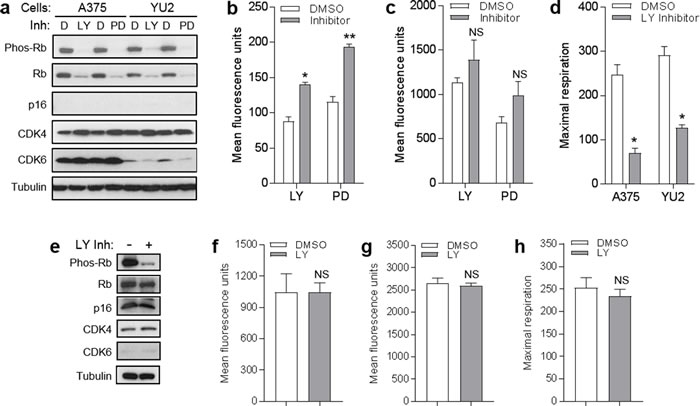 p16 represses cell cycle progression through binding of CDK4/6, which inhibits Rb phosphorylation [2]. We investigated whether p16-mediated modulation of mitochondrial dynamics was operating through this canonical CDK/Rb pathway by testing whether blocking these CDK could mimic the effects observed with p16 over-expression. First, we employed chemical CDK4/6 inhibitors to suppress Rb phosphorylation. As shown in Figure 6a, both LY-2835219 (LY) and PD-0332991 (PD) dramatically reduced levels of phosphorylated Rb in both A375 and YU2 human melanoma cells (which do not express detectable amounts of p16). We noted that these inhibitors also reduce levels of total Rb, which has been recently reported (in bladder cancer cells) to be due to negative feedback of CDK inhibition on RB gene transcription [28]. Under these conditions, neither inhibitor affected levels of CDK4 and CDK6 in A375 cells or levels of CDK4 in YU2 cells (Figure 6a). Neither inhibitor caused a reduction in mitochondrial superoxide in A375 cells (Figure 6b), as was seen above with forced p16 expression (Figure 5b). In fact, superoxide levels were increased, perhaps as part of a compensatory response. Similarly, neither inhibitor caused a reduction in mitochondrial mass in A375 cells (Figure 6c). Comparable results were seen in YU2 cells treated with the PD inhibitor (Supplementary Figure 1). In addition, neither inhibitor caused an increase in mitochondrial respiration in either A375 or YU2 cells (Figure 6d), as was seen above with forced p16 expression in A375 cells (Figure 5c). The decreased respiration may represent a compensatory response, as noted above. In primary melanocytes, the LY inhibitor reduced levels of phosphorylated Rb without affecting levels of p16, CDK4, or Rb (Figure 6e). Under these conditions, we did not observe a reduction in mitochondrial superoxide (Figure 6f), as was seen above with forced p16 expression in melanocytes (Figure 5f). Similarly, the LY inhibitor did not cause a reduction in mitochondrial mass in melanocytes (Figure 6g). Finally, the LY inhibitor did not cause an increase in mitochondrial respiration (Figure 6h), as was seen above with forced p16 expression in melanocytes (Figure 5g).