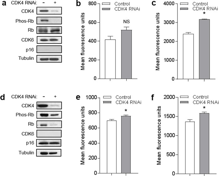 Figure 7: CDK4 knockdown does not mimic effects of p16 on mitochondrial dynamics. a. YU2 melanoma cells were transfected with control or RNAi specific for CDK4, then lysates were analyzed by Western blotting 72 h later. b. Cells in a. analyzed for mitochondrial superoxide by flow cytometry. Error bars indicate SEM from triplicate determinations; NS, not significant. c. Cells in a. analyzed for mitochondrial mass by flow cytometry. Error bars indicate SEM from triplicate determinations; *P < .001. d. Human melanocytes were transfected with control or RNAi specific for CDK4, then lysates were analyzed by Western blotting 72 h later. e. Cells in d. analyzed for mitochondrial superoxide by flow cytometry. Error bars indicate SEM from triplicate determinations; *P = .04. f. Cells in d. analyzed for mitochondrial mass by flow cytometry. Error bars indicate SEM from triplicate determinations; *P = .04.