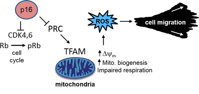 Figure 8: p16 control of mitochondrial biogenesis, ROS, and cell migration. Loss of p16 results in aberrant mitochondrial biogenesis, characterized by increased mitochondrial mass but dysfunctional respiration which results in elevated ∆ψm and ROS. These functions are independent of the CDK4/Rb pathway and cell cycle control.
