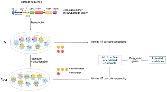 Figure 1: shRNA barcode library screening. 10,000 genes were targeted by shRNA-mediated knockdown using modules 1 and 2 of the Cellecta Decipher library in BxPC3 pancreatic cancer cells in two separate screens carried out in identical manner. Genes were targeted by shRNA expression constructs, which are identifiable by barcode sequences. Cells were collected at t0 and tend, barcode sequences were amplified from genomic DNA and subjected to high-throughput sequencing and compared for their abundance.
